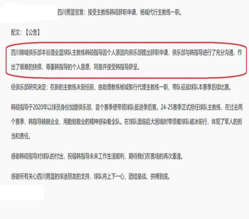 值得一提的是,在刚刚,CBA本赛季第六个下课的主教练也是产生了,他就是四川队主教练韩硕,根据四川队公布的内容,此番韩硕下课,是他本人主动申请辞职,随后,四川队也是与韩硕进行了充分地沟通,最终,做出了一个无奈的选择,尊重韩指导的个人意愿,同意了他的辞职。