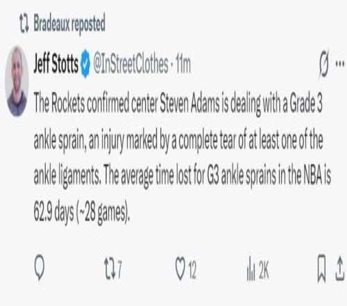 在这场比赛期间,火箭记者杰夫-斯科特报道,亚当斯确诊三级脚踝扭伤,这种伤势意味着脚踝韧带有撕裂,在NBA中三级扭伤平均缺席时间大约是62.9天(28场比赛)。