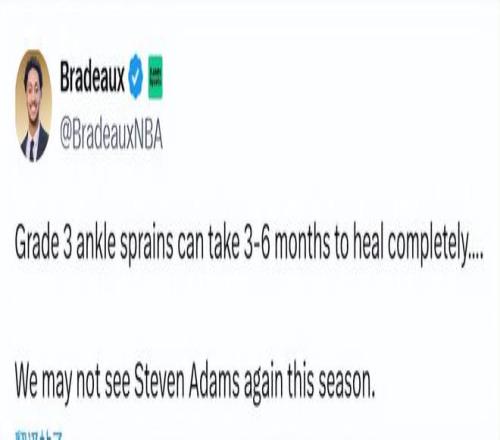 北京时间1月21日,休斯顿火箭队中锋史蒂文-亚当斯将无限期缺阵。在球队今日迎战圣安东尼奥马刺队的赛前采访中,主帅乌度卡宣布,亚当斯遭遇了左脚踝三级扭伤。这位火箭队主教练表示,这名内线大将的归期目前尚未确定。队记表示,三级脚踝扭伤预计需休战3-6个月,有可能赛季报销。