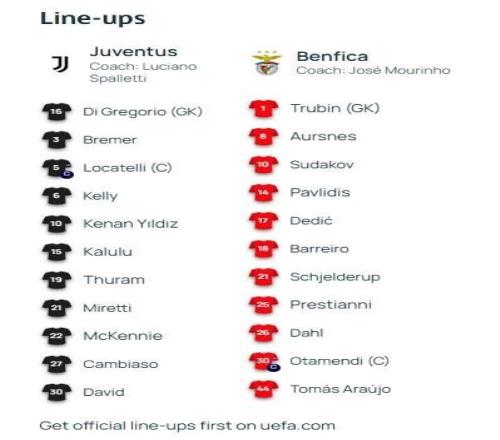 北京时间1月22日04:00,欧冠 联赛阶段 第7轮,尤文图斯主场迎战本菲卡,赛前双方球队首发名单公布如下:本菲卡队免费观看_伊尔迪兹免费观看_欧冠赛场免费观看_本菲卡队高清在线_伊尔迪兹高清在线_欧冠赛场高清在线